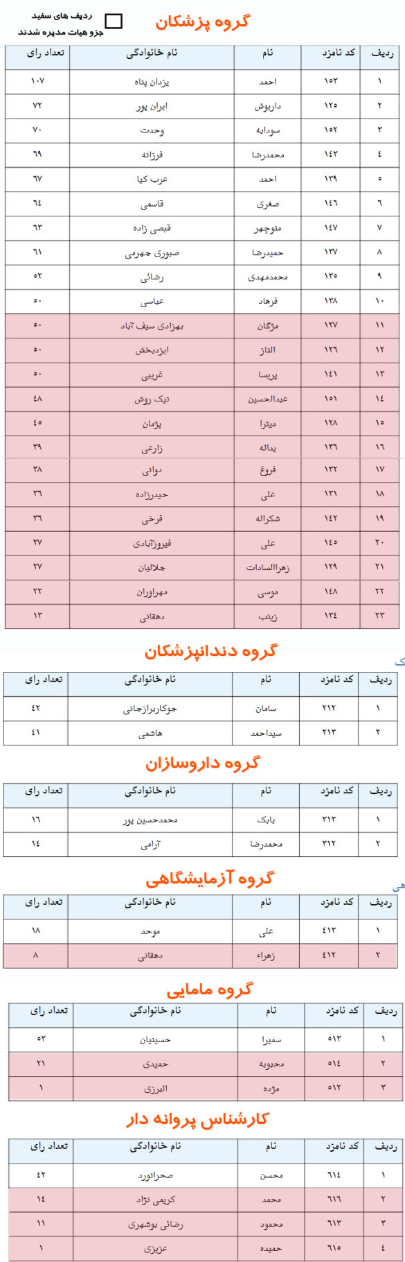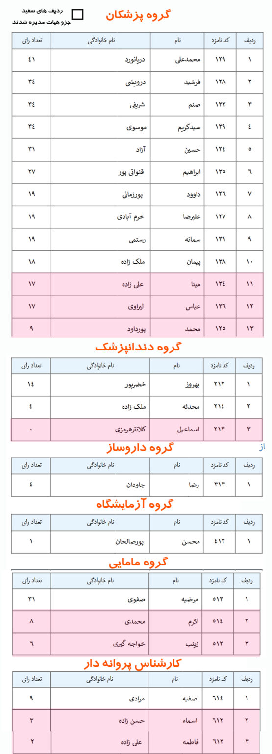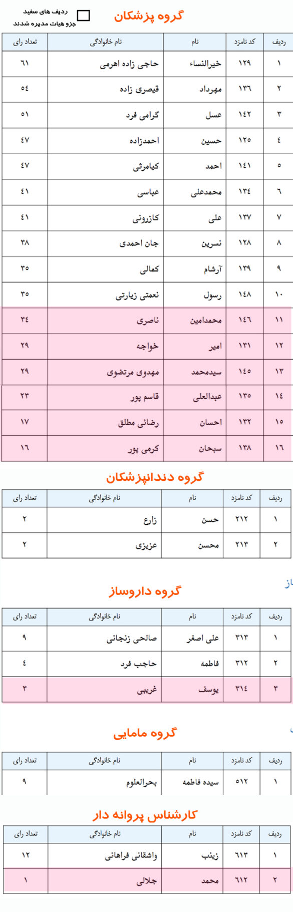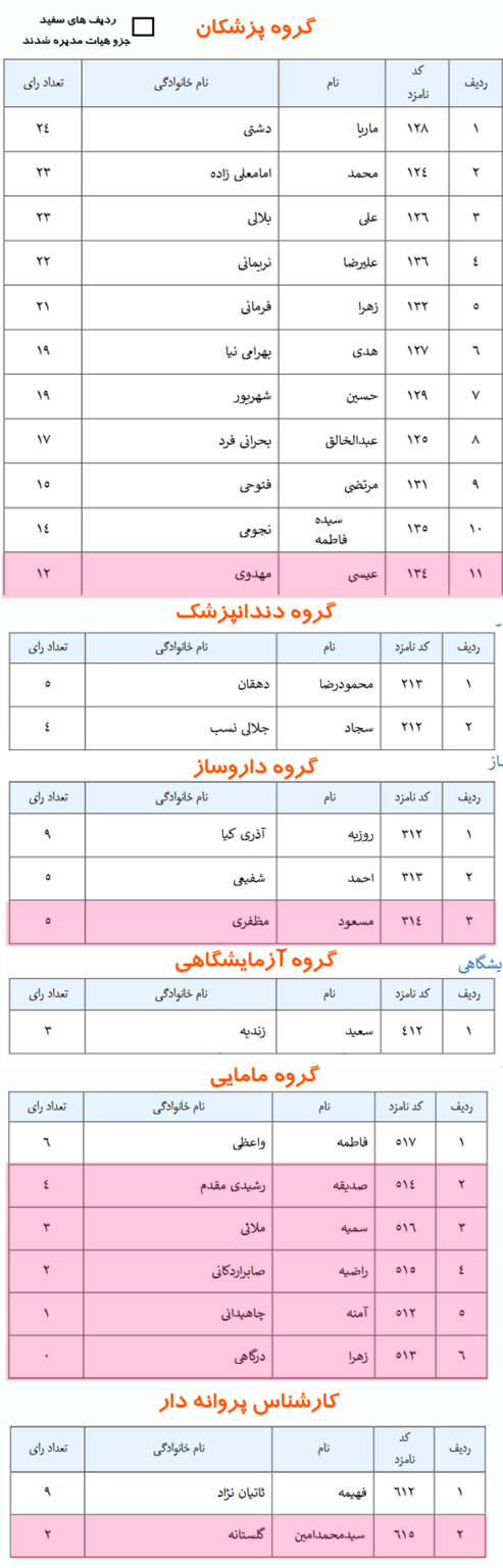 کد خبر : 190031 تاریخ : 1404/07/26 21:30:15 اعضای هیات مدیره نظام پزشکی در استان بوشهر مشخص شد + نتایج پیغام: اعضای هیات مدیره نظام پزشکی در حوزه های۴ گانه استان بوشهر مشخص شدند. به گزارش پیغام؛ نهمین دوره انتخابات هیأت مدیره سازمان نظام پزشکی بوشهر روز جمعه ۲۵ مهرماه ۱۴۰۴ در استان بوشهر، همزمان با سراسر کشور، برگزار شد. در این انتخابات که با حضور پرشور اعضای جامعه پزشکی استان برگزار شد، پزشکان، دندانپزشکان، داروسازان، ماماها و کارشناسان پروانه دار با مشارکت فعال خود، اعضای جدید هیئتمدیره را برای دوره جدید انتخاب کردند. گفتنی است، هیات مدیره نظام پزشکی در هر حوزه انتخابیه شامل 17 نفر می باشد که در برخی از حوزه ها به دلیل عدم کاندیدا در برخی رسته ها نظیر آزمایشگاه، تعداد هیات مدیره نهایی کمتر می باشد. بر اساس اعلام هیئت اجرایی انتخابات ، منتخبین زیر بهعنوان اعضای اصلی هیئتمدیره سازمان نظام پزشکی استان بوشهر بر اساس نتایج اولیه ،انتخاب شدند: حوزه بوشهر، دشتی، تنگستان و خارگ حوزه دشتستان حوزه گناوه و دیلم حوزه کنگان و شهرستان های جنوبی منبع: پایگاه خبری تحلیلی پیغام لینک مستقیم : http://peigham.ir/shownews.aspx?id=190031