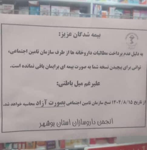 به گزارش پیغام؛ داروخانههای شهر بوشهر بنا بر اطلاعیه رسمی انجمن داروسازان استان، پذیرش نسخههای بیمهای را متوقف کردهاند و با نصب اطلاعیه در داروخانه ها اعلام کرده اند «علیرغم میل باطنی از تاریخ 15 آبان نسخ سازمان تامین اجتماعی به صورت آزاد محاسبه خواهد شد.» موضوعی که باعث نگرانی بیماران شده و آنها مجبورند داروهای خود را آزاد تهیه کنند.