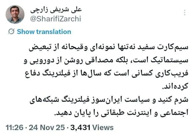 شریف زارچی: سیمکارت سفید نمونه وقیحانه تبعیض سیستماتیک