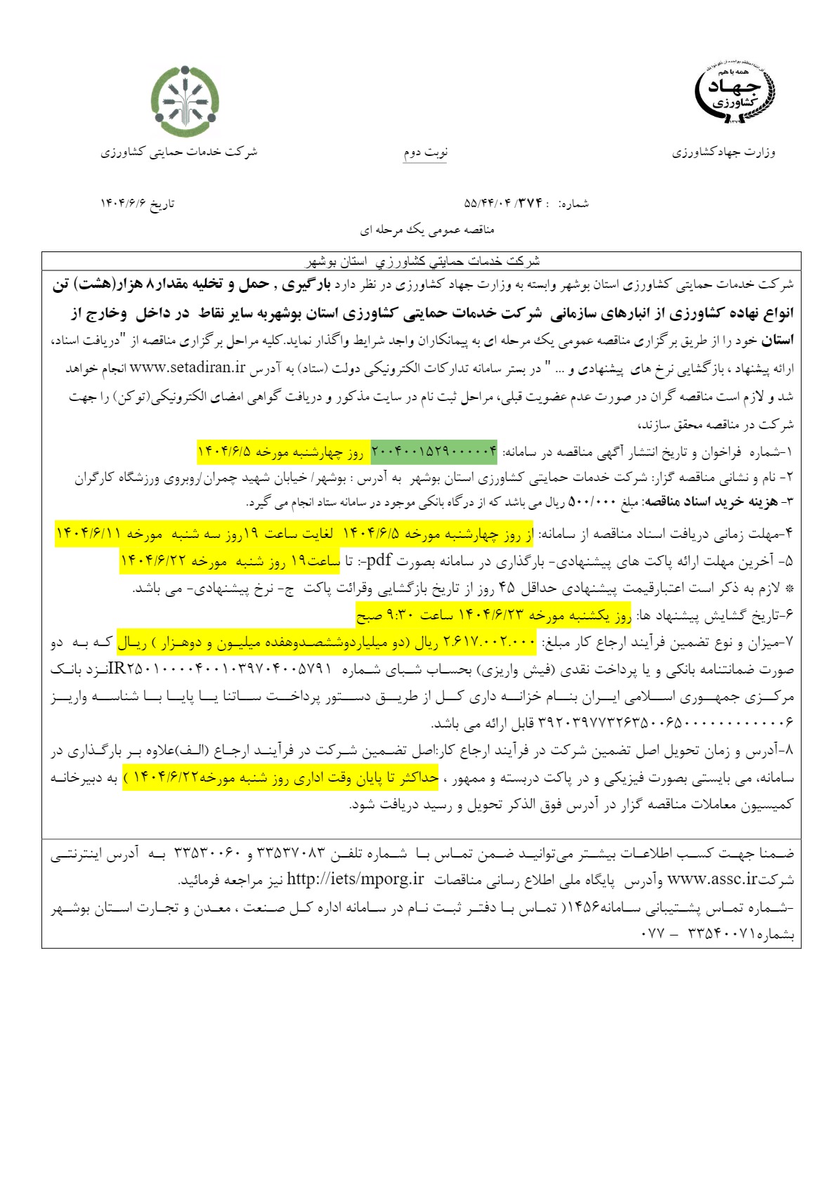 کد خبر : 190206 تاریخ : 1404/06/05 08:14:15 مناقصه عمومی یک مرحله ای شركت خدمات حمايتي كشاورزي استان بوشهر شركت خدمات حمايتي كشاورزي استان بوشهر وابسته به وزارت جهاد کشاورزی در نظر دارد بارگيري , حمل و تخليه مقدار8 هزار(هشت) تن انواع نهاده كشاورزي از انبارهاي سازمانی شرکت خدمات حمایتی کشاورزی استان بوشهربه ساير نقاط در داخل وخارج از استان خود را از طریق برگزاري مناقصه عمومي یک مرحله ای به پيمانكاران واجد شرايط واگذار نمايد شناسه آگهی"1989389 منبع: پایگاه خبری تحلیلی پیغام لینک مستقیم : http://peigham.ir/shownews.aspx?id=190206